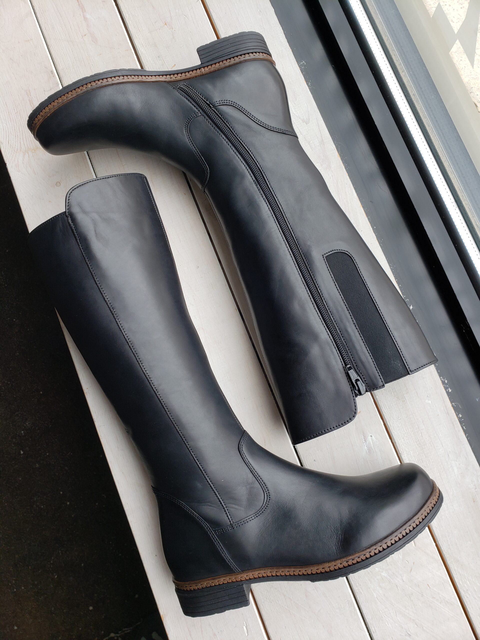 Please note that the calf width measures just shy of 14″ in circumference at the top of the 13″ tall shaft – however, there is a large 5″ stretch panel that allows for an extra 1.5″ in circumference- if needed:) These measurements are based on the size 6 sample, and the calf circumference will increase slightly with each foot size.