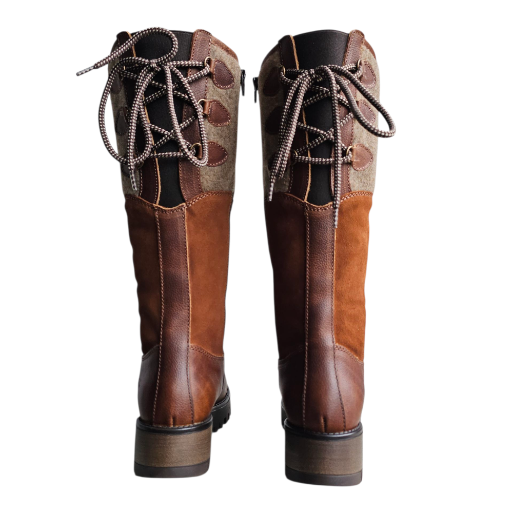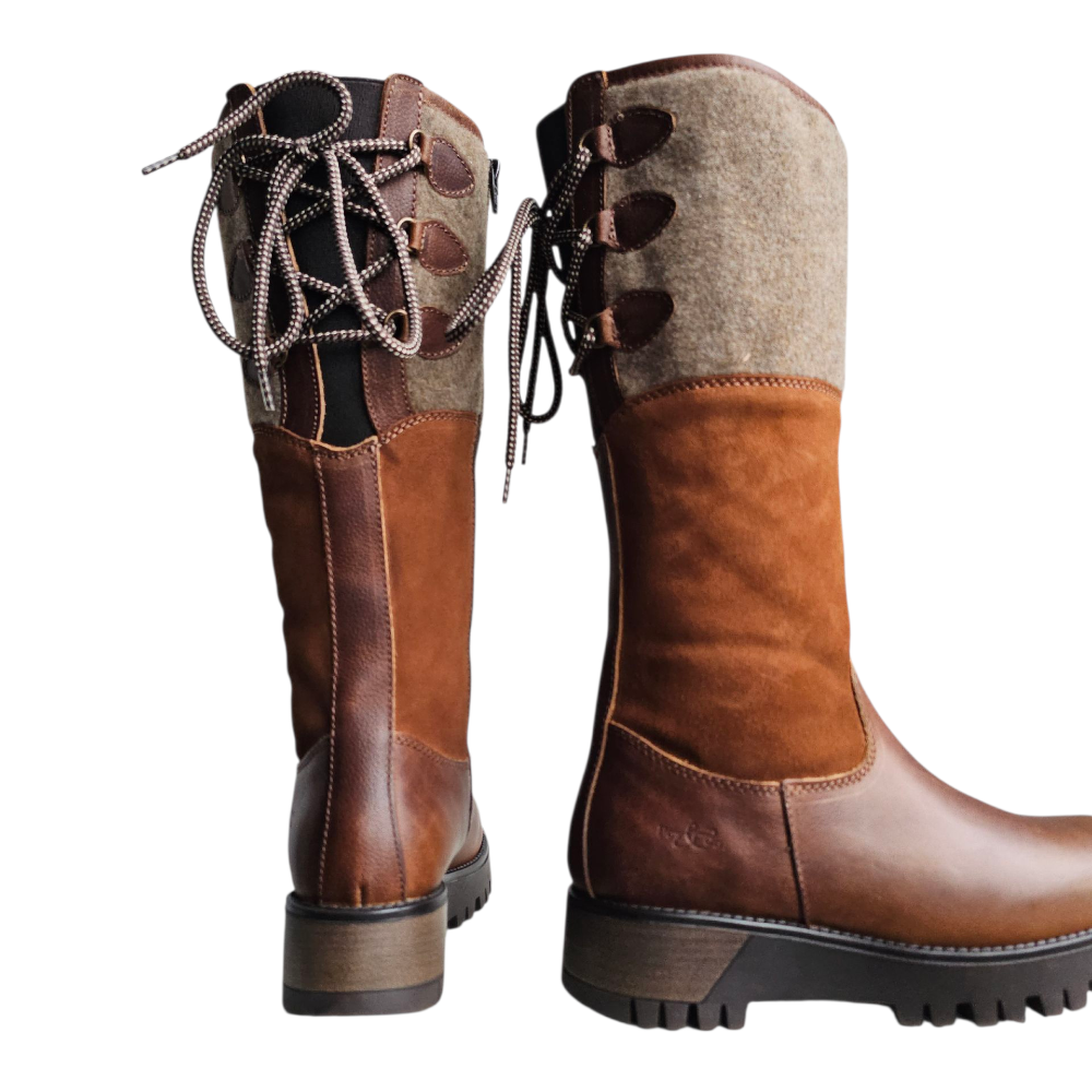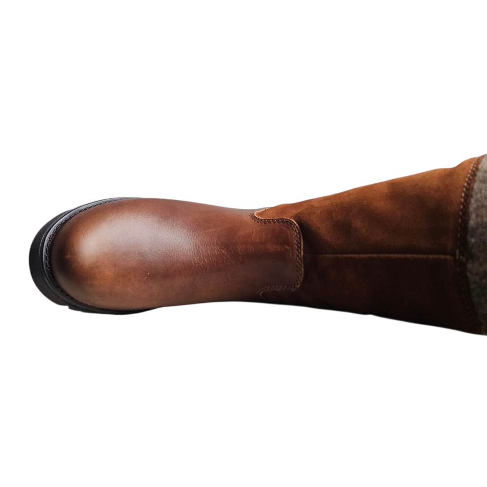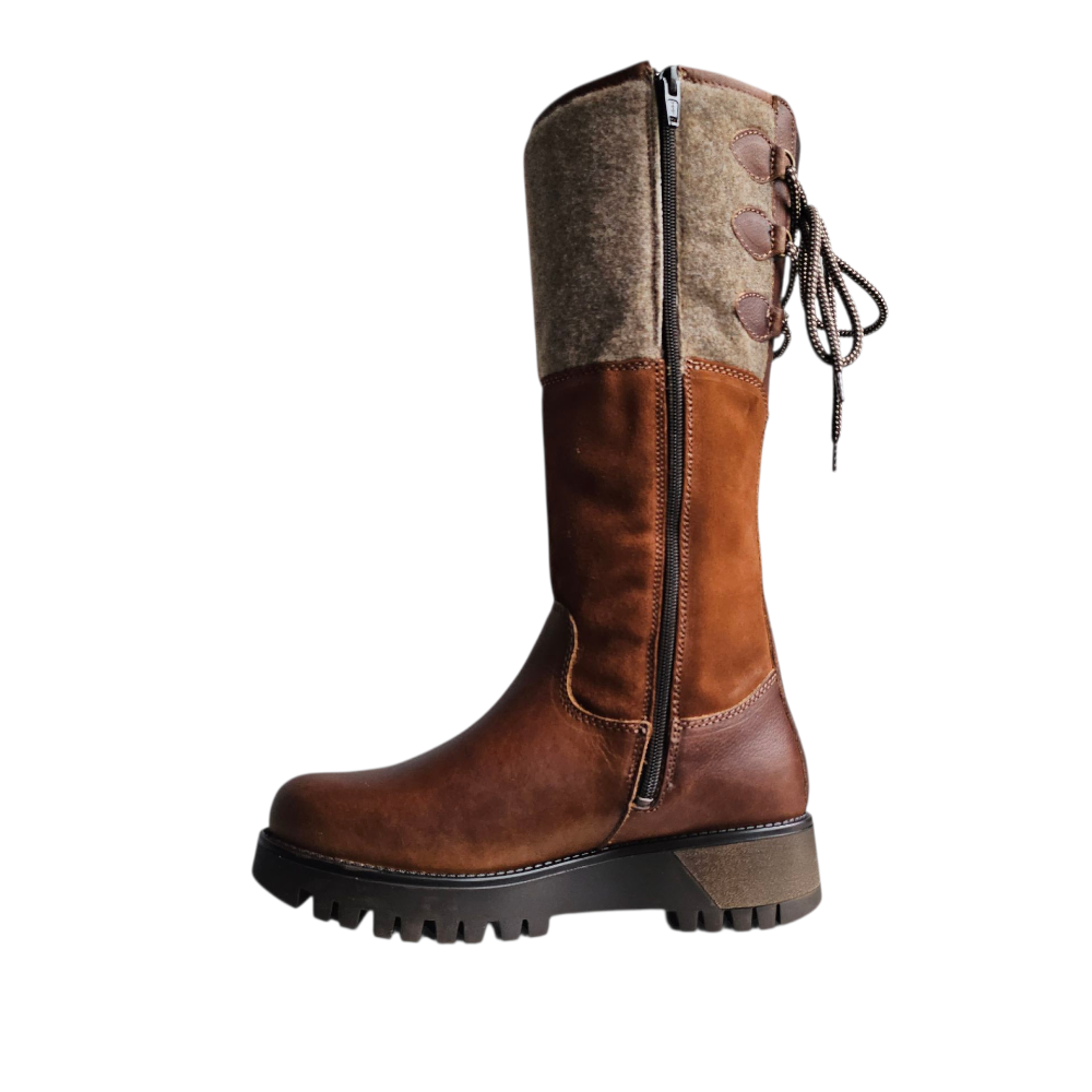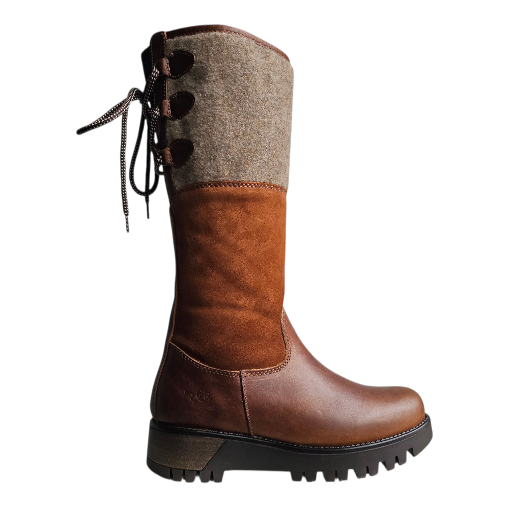 The Bos & Co Goose waterproof boot is a winter weather necessity. Leather at the toe, suede at the ankle, and wool at the knee, this boot has a cool pieced-together look that adds interest to any outfit. The waterproof construction means your feet will stay warm and toasty as you trudge through the snow. The rubber outsole has a unique lugged tread design and features the G2 Ice Grip rubber compound to provide traction on wet ice and other slippery surfaces. Zipper closure makes for easy on and off, and the lace-up back allows you to adjust the boot for the perfect fit