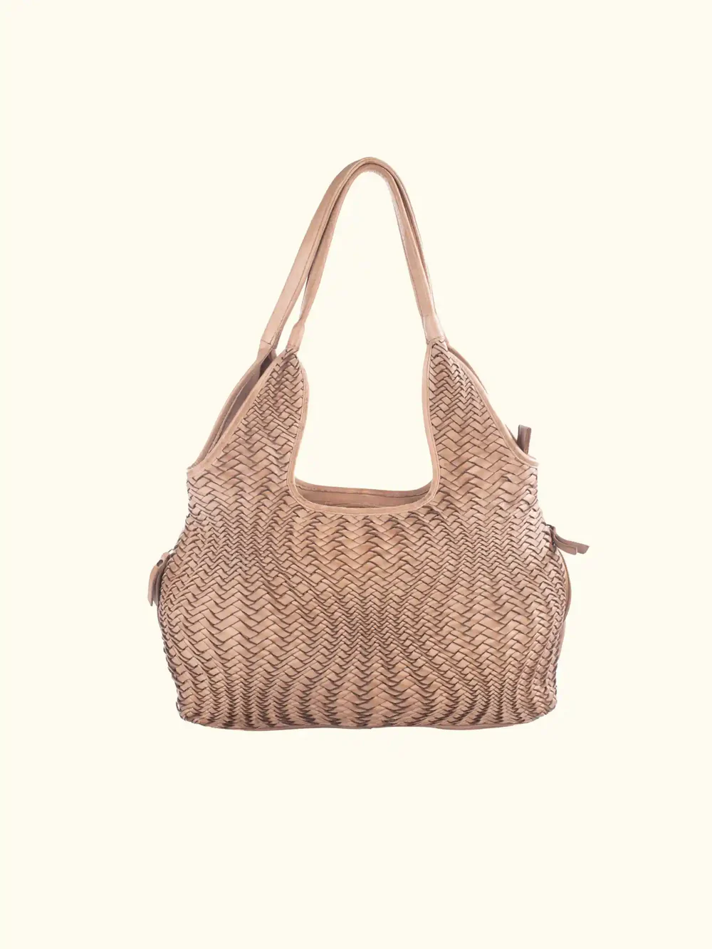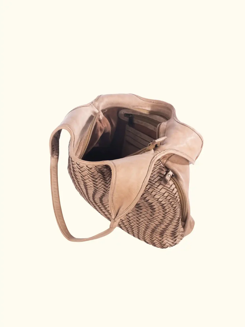 This spacious shoulder bag from the Woven Leather Collection seamlessly blends practicality with rustic elegance. It features a top metal zipper closure and multiple slips, holders, and pockets for organized storage.