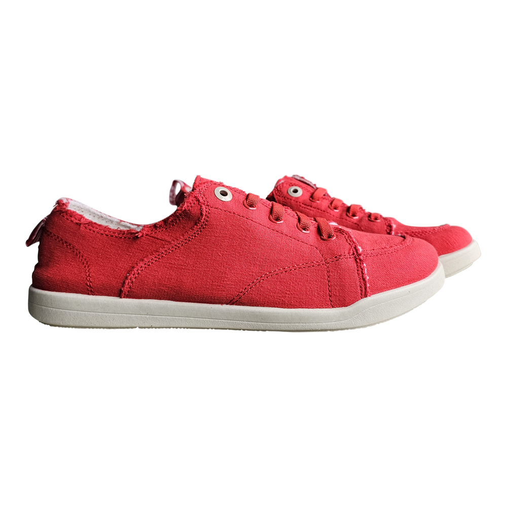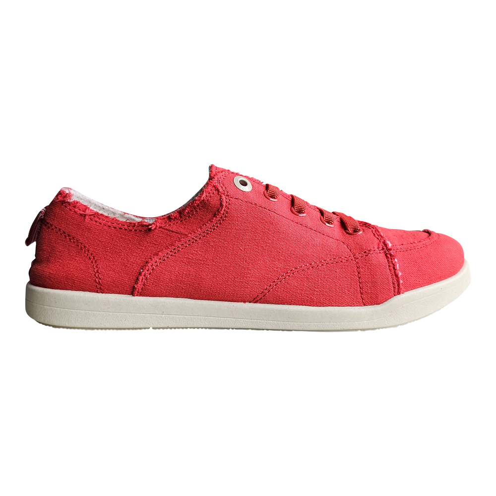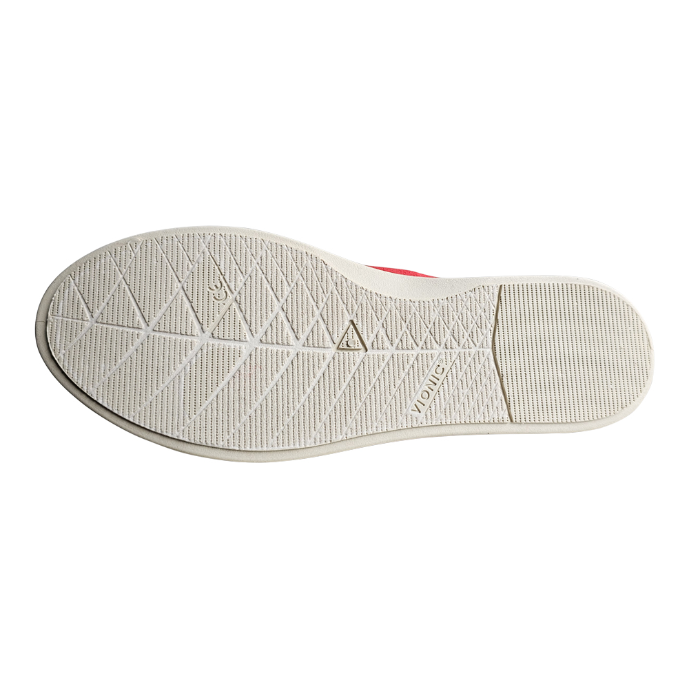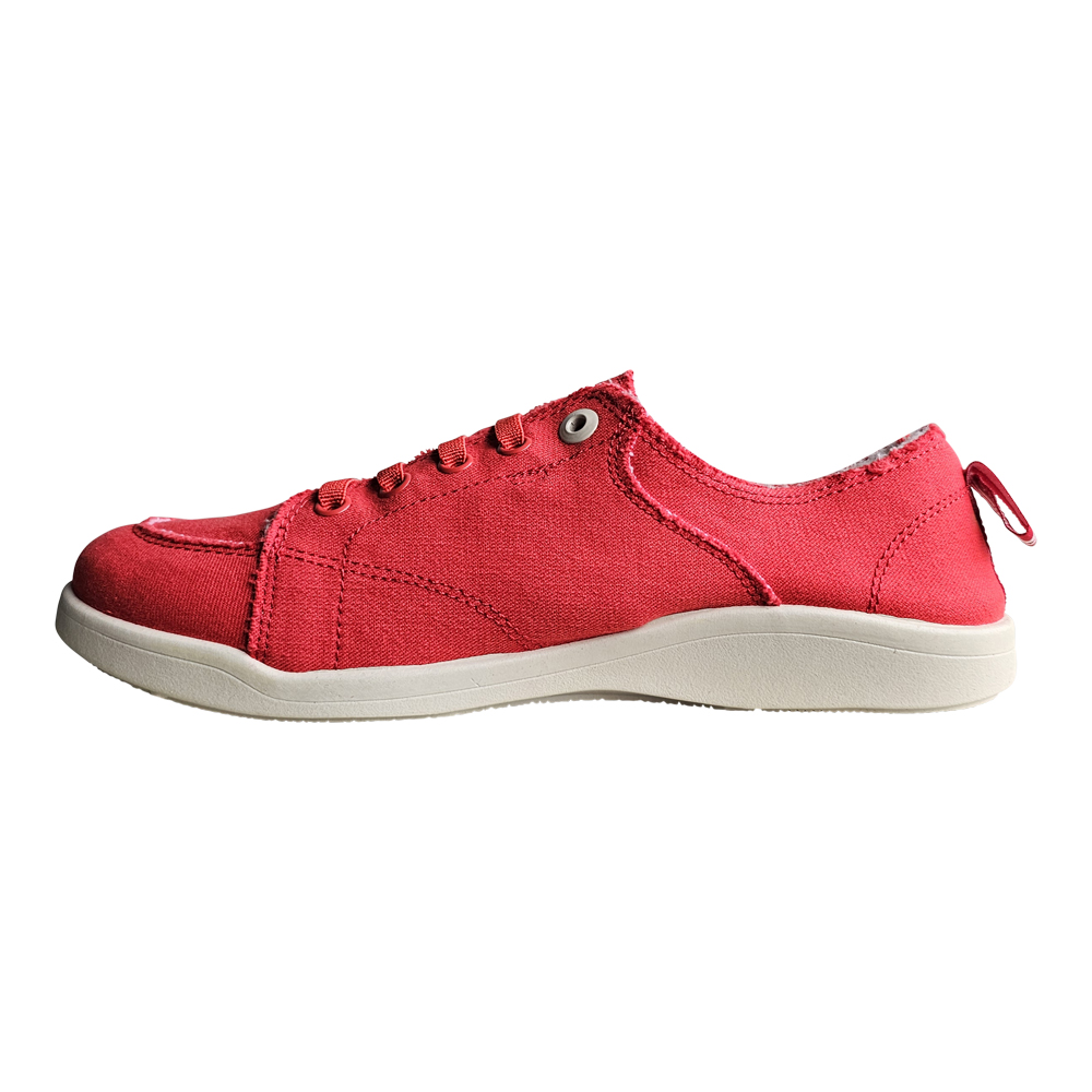 Sore cranky feet are zero match for the supportive comfort you will find when you wear these slip-on cuties from Vionic. No joke, we are talking softly cushioned EVA footbeds, paired with the corrective arch support you expect from Vionic. We call this style -Pismo- and those laces are not real laces, they are a secured stretch-elastic, so you just slip-on and go!! You would think that elastic would make them better for a wide foot, but no, not so much. If you have a slightly wider foot, average width, or slightly narrower foot, they will work for you. We’ve had them on a few truly wide feet, and the elastic bits on top do not stretch enough to be comfortable. Wide feet do better in the Vionic Malibu. As for length, I am wearing exactly the same size I do in my athletic shoes and so far everyone we have had them on has been the same. This is not the sort of shoe you want to -size up- in just to be safe, because then the arch support will be in the wrong spot.